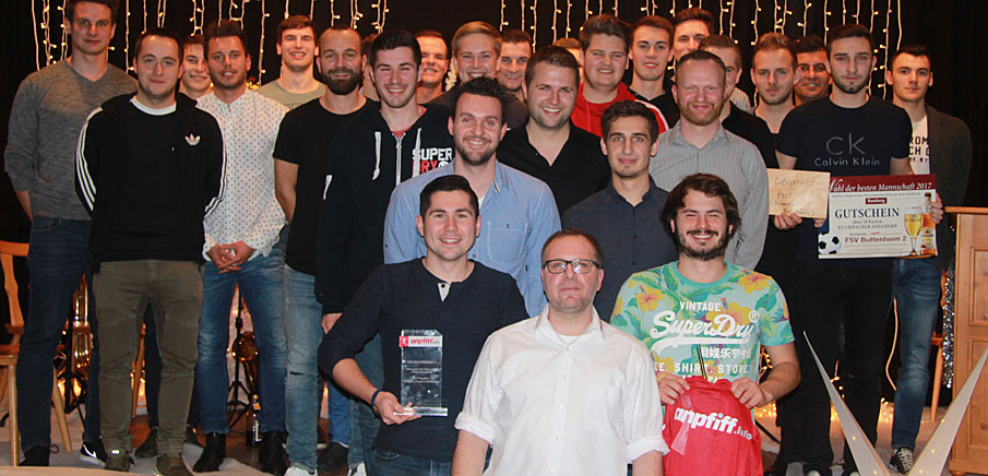 Die Buttenheimer Fußballer freuten sich über die verdiente Trophäe, die der Spielführer der Zweiten Mannschaft, Daniel Kalb, hält, sowie über zehn Trainingsleibchen, einen Gutschein über 100 Euro bei "Helmut's Hofschänke" Gut Leimershof und 100 Liter Bier der Kulmbacher Brauerei.