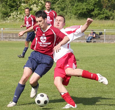 Im Abstiegskampf heißt es nun, um jeden Ball zu fighten. So wie hier am letzten Spieltag beim Spiel des FC Altendorf gegen den SV Reundorf (Fabio Schleelein links und Steffen Lindner rechts).