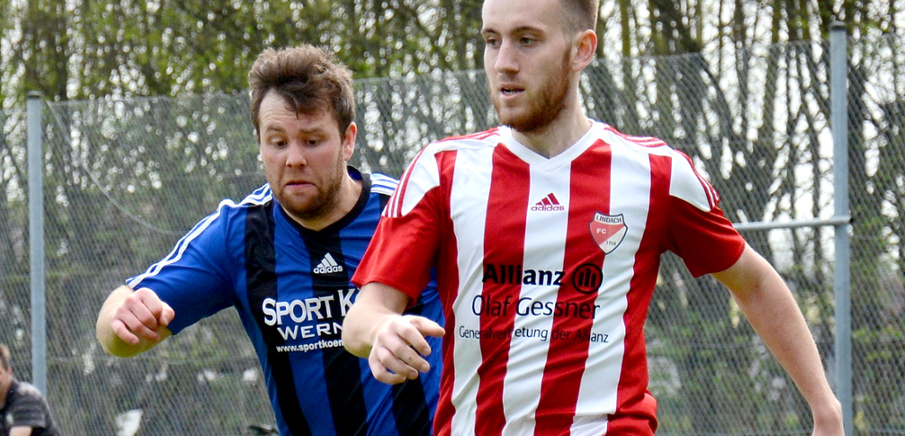 Lindachs Jonas Seger plante hier, vor dem Röthleiner Robert Falk mit der Hand zum Ball zu gehen.