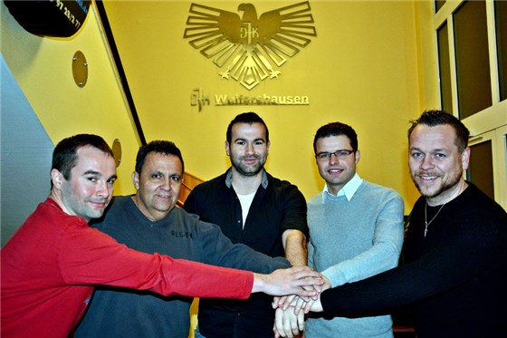 2017 war das: Fünf Mann ziehen in Wülfershausen bald an einem Strang - von links: Johannes Bauer (Abteilungsleiter DJK Burghausen), Rainer Schindelmann (Abteilungsleiter DJK Wülfershausen), Niko Wolf, Fabian Benkert und Stanislaw Schmidt (Vorstand Sport bei der DJK Wülfershausen).