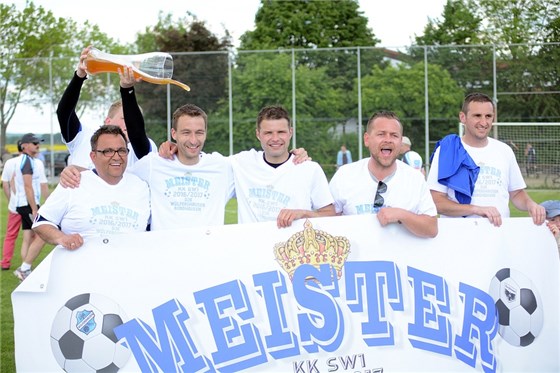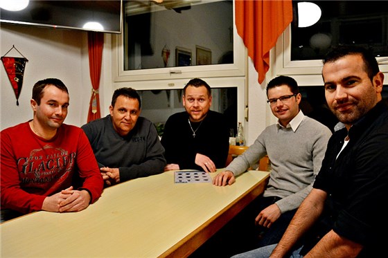 Gesellige Runde im Wülfershausener Sportheim Anfang 2017 - von links: Johannes Bauer (Abteilungsleiter DJK Burghausen), Rainer Schindelmann (Abteilungsleiter DJK Wülfershausen), Stanislaw Schmidt (Vorstand Sport bei der DJK Wülfershausen) sowie das künftige Spielertrainer-Duo Fabian Benkert und Niko Wolf.