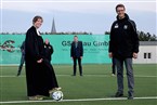 Nach der Platzsegnung durch Pfarrerin Mareike Kraemer gibt Vorstand Jörg Ebert den neuen Kunstrasenplatz frei.