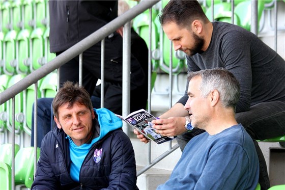 Michael Hutzler (li.) mit Vorstandsvorsitzendem Jörg Schmalfuß (o.) und Abteilungsleiter Sascha Dorsch (re.) auf der Tribüne im Fuchspark. "Ich bin den beiden dankbar, dass sie mir die Chance gegeben haben, hier Trainer zu sein. Ich freue mich darauf - wenn die Auflagen es mal wieder zulassen - die Zeit bei einem Bier gemeinsam Revue passieren zu lassen!"