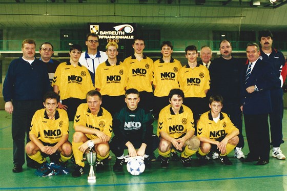 Mit großer Freude bei den Sportveranstaltungen: Manfred Kreitmeier (vorne rechts) bei der Siegerehrung in der Oberfrankenhalle mit den Trainer Horst Mayer (re., hinten) und Martin Fraß (Mitte, hinten)