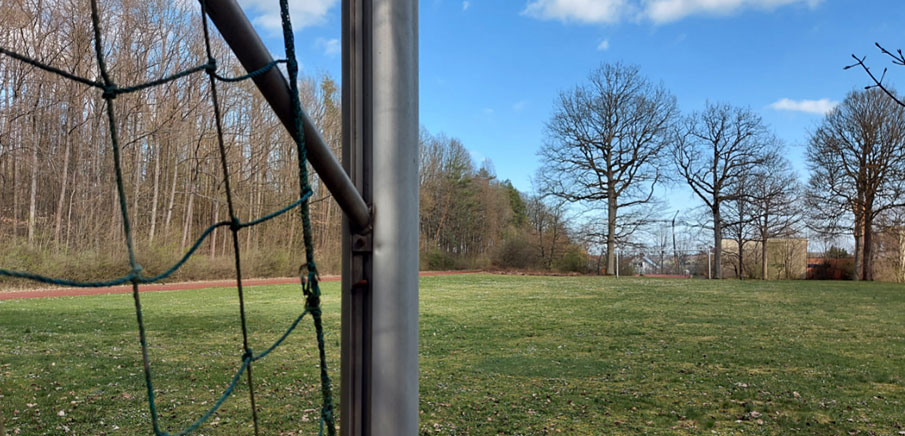 Tipps für Rater: Hier ist keine offizielle Fußballmannschaft regelmäßig zu Hause (die trainiert und spielt in normalen Zeiten Luftlinie vielleicht nur 300 Meter entfernt). Zweitens: Der Platz ist an sich für Kinder gedacht, denn er gehört zur Grundschule des Ortes, die den Namen "Schweinfurter Rhön" trägt. Was ein wenig verwirrt, denn das gesuchte Rechteck befindet sich im Landkreis Schweinfurt und nicht im Spielkreis Rhön.