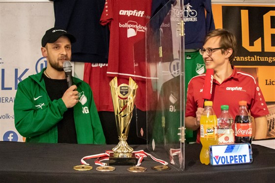 Trotz Corona ganz nah am Geschehen: Spielkreisleiter Alexander Rausch interviewt Gössenheims Justin Gretzer.