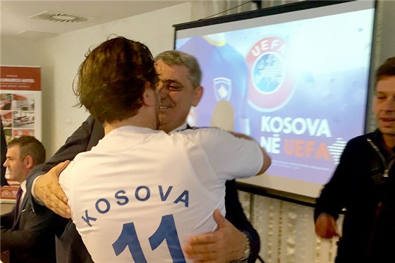 Florim Gashi feiert mit dem Fadil Vokkri, dem jetzigen Präsidenten des Kosovarischen Fußballverbandes und Ex-Nationalspieler Ex-Jugoslawiens (der einzige, der kosovarische Wurzeln hatte), die Aufnahme in die UEFA.