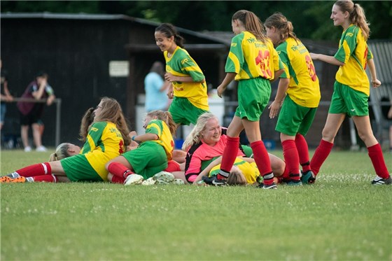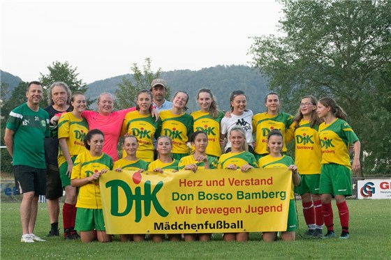 Am Mittwoch den 26.06.19 spielt die U17 der DJK Don Bosco Bamberg gg. Weißenstadt in Untersteinach um den Aufstieg in die Landesliga. In einem engen und spannenden Spiel fiel die Entscheidung erst im Elfmeterschießen! Die Weißenstädterinnen erwischten den besseren Start und gingen nach einem katastrophalen Rückpass einer DJK-Spielerin mit 1:0 in Führung. Die sichtlich geschockten DJK´lerinnen retteten sich in die erste Trinkpause. Hier fand Trainer M. Hornung scheinbar die richtigen Worte. Auf einmal lief der Ball nur noch in Richtung gegnerisches Tor. Mit einem Doppelschlag drehte P. Reinfelder das Spiel zum 2:1. Nach der zweiten Trinkpause der ersten Halbzeit schlug das Pendel zu Gunsten der Weißenstädterinnen aus. Innerhalb von zwei Minuten erzielte C. Kießling nach krassen Abwehrfehlern die 3:2 Halbzeitführung für die Ostoberfranken. Nach der Pause kamen die Bambergerinnen mit viel Entschlossenheit aus der Kabine und A. Wilson-Torres erzielte nach einer Ecke den 3:3-Ausgleichstreffer. Nun ging es bei immer noch großer Hitze hin und her. Kurz vor Schluss bleib den mitgereisten Bamberger Fans noch zweimal fast das Herz stehen, als die Fichtelgebirgs-Mädels zwei Hundertprozentige liegen ließen! So ging es direkt in das Elfmeterschießen. P. Reinfelder, L. Stöcklein u. C. Reutter trafen alle sicher, wobei die Weißenstädterinnen die ersten beiden Elfmeter über das Tor jagten. Es folgte der 1:3-Anschlus und A. L. Lebede verwandelte sicher zum 4:1-Endstand! Der Jubel bei den Spielerinnen und mitgereisten Fans war groß und nun spielt die DJK-U17w erstmals in ihrer Vereinsgeschichte in der Landesliga! Hier werden für die neue Saison junge Mädels der Jahrgänge 2003/2004/2005 gesucht. Bei Interesse bitte bei K. Schmitt unter 0179-4956488 melden.
