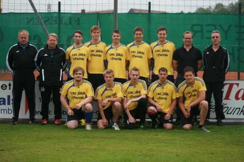 Die neuen Trainer Christian Kugler und Ulrich Adelhardt mit den neuen Spielern Sebastian Böhm, Manuel Lehner, Patrick Gradl, Julian Thumbeck, Felix Leisner, Abteilungsleiter Thomas Gsell und Spielleiter Erste Mannschaft Ralf Tetzeli von Rosador (stehend, v.l.n.r.). Unten knieend (v.l.n.r.) die weiteren Neuzugänge Eyk Rösner, Simon Schwendner, Alexander Failner, Lukas Knappik und Daniel Siegler. Beim Fototermin fehlte Devit Akdemir.