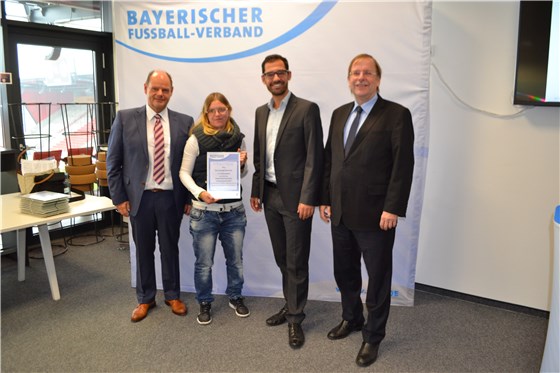 Die Ehrung nahmen der DFB-Vizepräsident für Amateurfußball und Vorsitzender des Bayerischen Fußball-Verband e.V. Dr. Raimund Koch (rechts außen auf dem Bild) und der BFV-Schatzmeister Jürgen Faltenbacher (links außen auf dem Bild) vor.