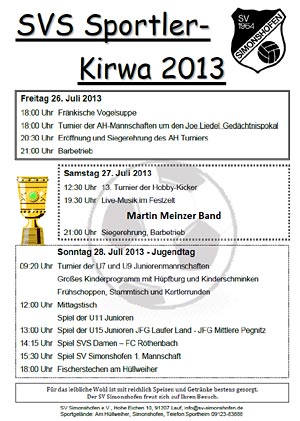 Der Sportverein Simonshofen richtet vom 26.-28.Juli 2013 wieder seine traditionelle Sportlerkirchweih aus; seit dem Jahre 1979 ist dies fester Bestandteil des Dorflebens in Simonshofen. In den letzten Jahren hat die Veranstaltung, neben dem sportlichen Teil, auch Eventcharakter erlangt. Darunter fällt auch das Turnier der Hobby- und Freizeitkicker am Samstag, an dem 12 Mannschaften teilnehmen. Unter anderem auch wieder das Team der Kirwamadla Simonshofen. Ein weiterer Publikumsmagnet ist das 19. Fischerstechen am Sonntag, an dem Politprominenz aus dem Stadtrat antritt.