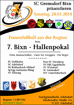 Die SC Gremsdorf Bixn veranstalten auch in diesem Winter ihren Bixn-Hallenpokal. Am Sonntag, 28.01.2018 spielen in der Aischgrundhalle Adelsdorf ab 11.00 Uhr wieder zehn Mannschaften um den Turniersieg.