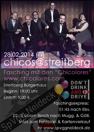 Am Faschingsfreitag ist es wieder soweit: Die "Chicolores" (ehemals "Los Chicolores") kommen ins Bürgerhaus nach Streitberg. Einlass ist ab 19:00 Uhr; ab ca. 21:00 Uhr spielen die Chicolores.