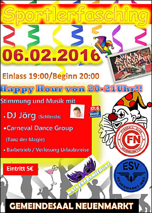 Auf gehts zum Sportlerfasching des FC und ESV Neuenmarkt am 06.02.16 in den Gemeindesaal Neuenmarkt ... Happy Hour ... Carneval Dance Group ... DJ Jörg ... Urlaubsreise zu gewinnen !!