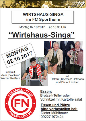 Am Montag den 02.10.2017 ab 18:30 Uhr veranstaltet der FC Neuenmarkt wieder sein Wirtshaus Singen.