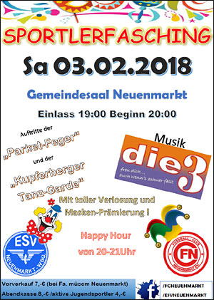 Auf geht's zum Neuenmarkter Sportlerfasching am 03.02. in den Gemeindesaal nach Neuenmarkt!