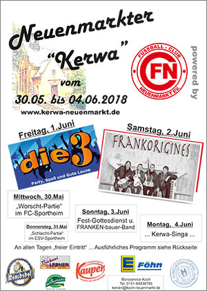 Beginn ist am Mittwoch den 30.05. mit der Worscht-Partie im FC Sportheim ... Freitag den 01.06. PARTY PUR mit der Band "Die Drei" im Gemeindegarten und am Samstag den 02.06. echt fränkische Musik mit "Frankorigines" ... von Freitag bis Montag Biergarten-Betrieb