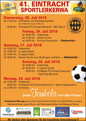 41. Eintracht Sportlerkerwa mit einem tollen Programm über 5 Tage. Details siehe Flyer.