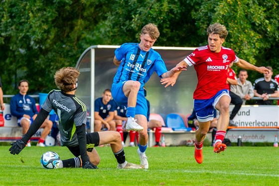 Bruck-Offensivmann Samuel Arles (in blau) legt sich das Leder vor der schnellen Antwort zum 2:1 an Mögeldorf-Keeper Valentin Freymann vorbei.