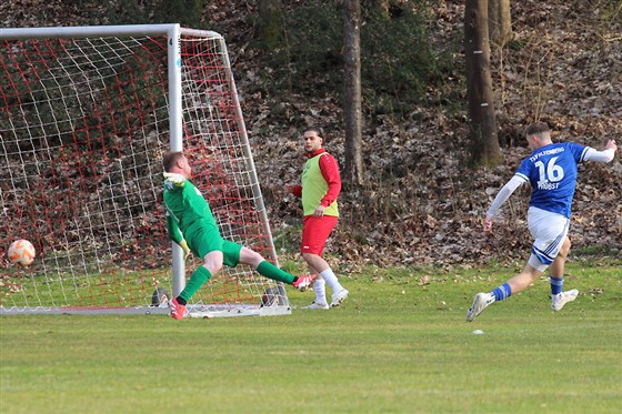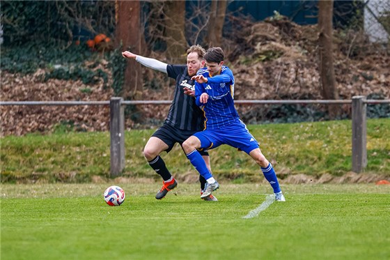 Grund zum Feiern hatte dagegen der TSV Altenberg (in blau) im Nachbarschaftsduell beim STV Deutenbach: Gäste-Akteur Probst (r.) brachte die Kugel hier entscheidend an STV-Keeper Kirchner vorbei und sorgte so für den 2:1-Siegtreffer seiner Altenberger Jungs auf dem Weihersberg.