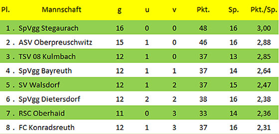 Wie im Vorjahr muss sich der ASV Oberpreuschwitz mit der Kronprinzessinnen-Rolle zufrieden geben, kann aber voller Stolz auf das Geleistete blicken. Eine einzige Punkteteilung gegen Untersteinach am 4. Oktober (0:0) kostete den ASV, der seine letzte Niederlage am 23. September 2012 kassierte (0:3 gegen Hollfeld 2), den geteilten ersten Rang. Trainer Raimund Philbert führte Oberpreuschwitz zu zwei Aufstiegen in Folge und klopft ebenso wie die SpVgg Stegaurach bereits wieder an das Türchen zur Meisterschaft. Gleiches gilt für den TSV 08 Kulmbach, der unter neuem Namen bislang noch unbesiegt ist und 2014 ebenfalls nur ein einziges Remis auf dem Spielplan stehen hat. Am 20. September reichte es trotz zweimaliger Zwei-Tore-Führung beim TSV Heldritt „nur“ zu einem 3:3, das unglücklicherweise auch erst in der 88. Minute besiegelt wurde. Ganze zwei Minuten trennten den TSV 08 demnach vom ganz großen Wurf, doch die Freude über ein gleichsam herausragendes abgelaufenes Kalenderjahr sollte dies nicht trüben.