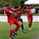 Sven Dießenbacher (liegend) mit vollem Einsatz gegen den Heilgersdorfer Libero Heiko Weidner