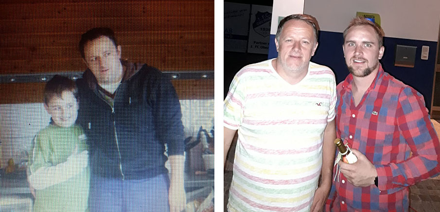 Zweimal Family: Ewald Rugel mit Sohnemann Lucas früher und heute mit Kumpel Bjrön Vogel.