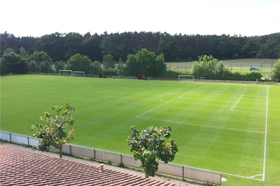 Großer Naturrasenplatz mit danebenliegenden Kunstrasen-Kleinfeld. Kabinen, Duschen und Sporthalle befinden sich ebenfalls auf dem Sportgelände.